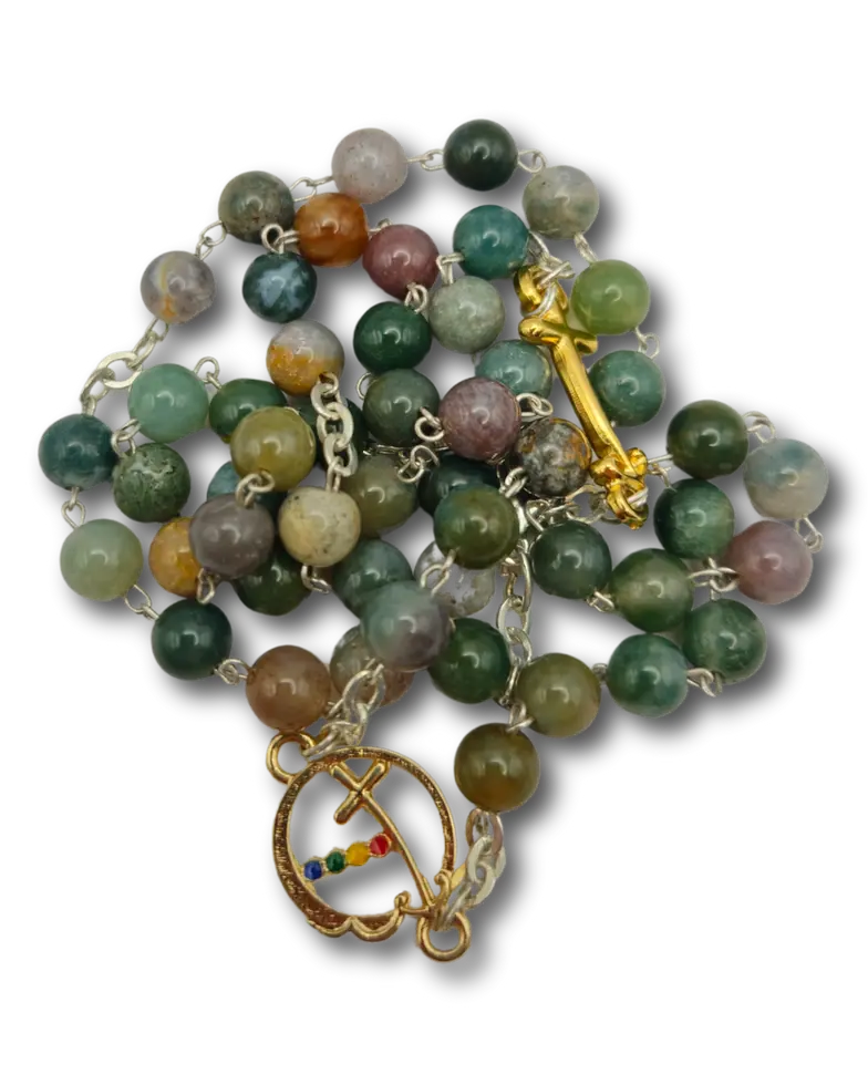 This elegant rosary is made with 6 mm diameter Indian agate beads , a natural stone with a unique charm, characterised by delicate green , brown and grey shades.