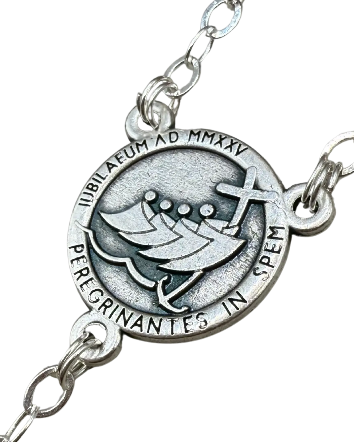 Un capolavoro di fede e devozione, questo rosario in metallo è arricchito da eleganti perline in vetro da 4 mm e dettagli unici che lo rendono un ricordo prezioso del Giubileo 2025.
